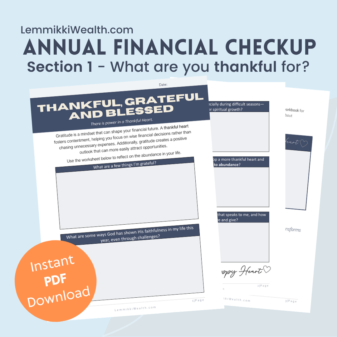 Use the worksheets below to record what you are Thankful for and attach them to your Annual Financial Checkup workbook for easy future reference. Also, be sure to document a few things you’re thankful for on the front cover of this Annual Financial Checkup workbook. When doing future reviews, it can be fun to look back and reflect on all that you have been grateful for.